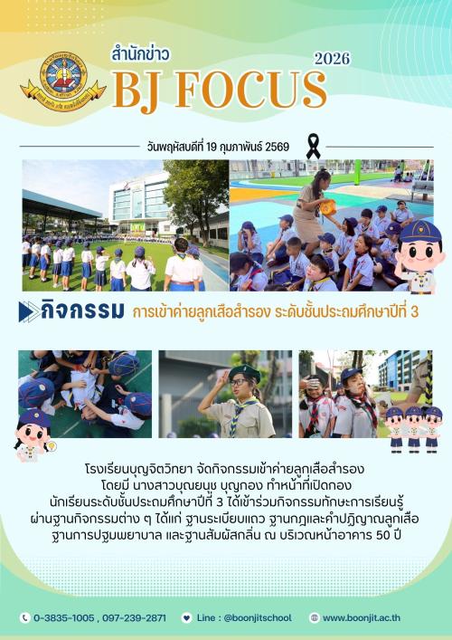วันพฤหัสบดีที่ 19 กุมภาพันธ์ 2569 โรงเรียนบุญจิตวิทยา จัดกิจกรรมเข้าค่ายลูกเสือสำรอง โดยมี นางสาวบุณยนุช บุญกอง ทำหน้าที่เปิดกอง นักเรียนระดับชั้นประถมศึกษาปีที่ 3 ได้เข้าร่วมกิจกรรมทักษะการเรียนรู้
