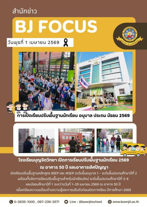 วันพุธที่ 1 เมษายน 2569 โรงเรียนบุญจิตวิทยา เปิดการเรียนปรับพื้นฐานนักเรียน 2569 ณ อาคาร 50 ปี และอาคารเลิศปัญญา เปิดเรียนปรับพื้นฐานหลักสูตร BIEP และ MSEP ระดับชั้นอนุบาล 1 - ระดับชั้นประถมศึกษาปีที่ 2