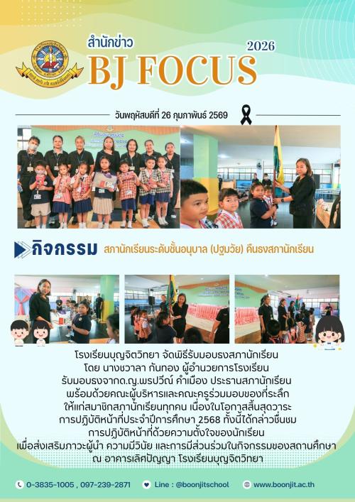 วันจันทร์ที่ 16 กุมภาพันธ์ 2569 โรงเรียนบุญจิตวิทยา จัดกิจกรรมเข้าค่ายลูกเสือสำรอง โดยมี นางสาวพิมพกานต์ มีเวช ทำหน้าที่เป็นประธานในพิธีเปิดกองนักเรียนระดับชั้นประถมศึกษาปีที่ 1