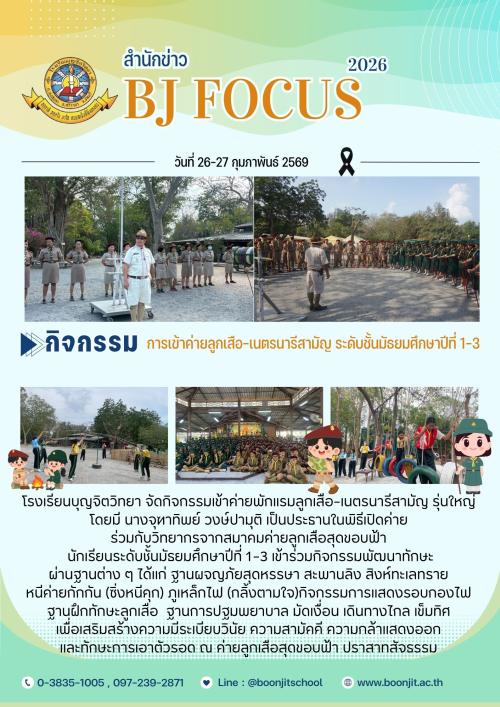วันที่ 26-27 กุมภาพันธ์ 2569 โรงเรียนบุญจิตวิทยา จัดกิจกรรมเข้าค่ายพักแรมลูกเสือ–เนตรนารีสามัญ รุ่นใหญ่ โดยมีนางจุฑาทิพย์ วงษ์ปามุติ เป็นประธานในพิธีเปิดค่าย ร่วมกับวิทยากรจากสมาคมค่ายลูกเสือสุดขอบฟ้า