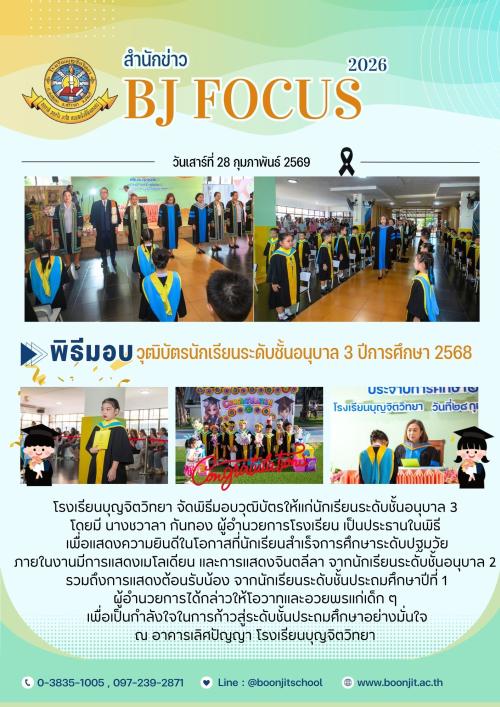 วันเสาร์ที่ 28 กุมภาพันธ์ 2569 โรงเรียนบุญจิตวิทยา จัดพิธีมอบวุฒิบัตรให้แก่นักเรียนระดับชั้นอนุบาล 3โดยมี นางชวาลา กันทอง ผู้อำนวยการโรงเรียน เป็นประธานในพิธี