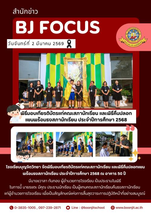 วันจันทร์ที่ 2 มีนาคม 2569 โรงเรียนบุญจิตวิทยา จัดพิธีมอบเกียรติบัตรแก่คณะสภานักเรียน และพิธีคืนปลอกแขนพร้อมธงสภานักเรียน ประจำปีการศึกษา 2568 ณ อาคาร 50 ปี