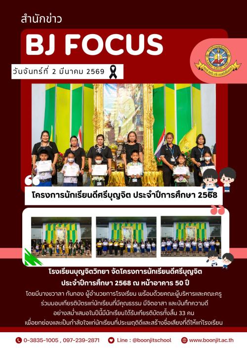 วันจันทร์ที่ 2 มีนาคม 2569 โรงเรียนบุญจิตวิทยา จัดโครงการนักเรียนดีศรีบุญจิต ประจำปีการศึกษา 2568 ณ หน้าอาคาร 50 ปี