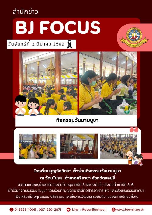 วันจันทร์ที่ 2 มีนาคม 2569 โรงเรียนบุญจิตวิทยา เข้าร่วมกิจกรรมวันมาฆบูชา ณ วัดมโนรม อำเภอศรีราชา จังหวัดชลบุรี ตัวแทนคณะครูนำนักเรียนระดับชั้นอนุบาลปีที่ 3 และ ระดับชั้นประถมศึกษาปีที่ 5–6