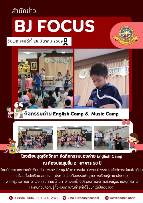 วันพฤหัสบดีที่ 26 มีนาคม 2569 โรงเรียนบุญจิตวิทยา จัดกิจกรรมของค่าย English Camp ณ ห้องประชุมชั้น 2 อาคาร 50 ปี โดยมีการแสดงจากนักเรียนค่าย Music Camp ได้แก่ การเต้น Cover Dance และโชว์การเล่นเมโลเดียน พร้อมทั้งนักเรียน อนุบาล - ประถม ร่วมกิจกรรมเข้าฐานการเรียนรู้ภาษาอังกฤษ จากครูชาวต่างชาติ เพื่อเสริมทักษะด้านภาษาและสร้างประสบการณ์การเรียนรู้อย่างสนุกสนาน และทบทวนความรู้ทั้งหมดภายในค่ายทีได้รับมาได้เป็นอย่างดี ดุเพิ่มเติม :