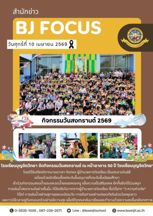 วันศุกร์ที่ 10 เมษายน 2569 โรงเรียนบุญจิตวิทยา จัดกิจกรรมวันสงกรานต์ ณ หน้าอาคาร 50 ปี โรงเรียนบุญจิตวิทยา โดยได้รับเกียรติจากนางชวาลา กันทอง ผู้อำนวยการโรงเรียน เป็นประธานในพิธี